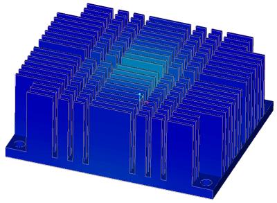铝,K = 148.62 W/m℃ TIM, K = 24 W/m℃ 封装,K = 2 W/m℃ | 封装热流量 = 5 W 热传递系数 = 5 W/m^2℃ 流体体表温度 = 20℃ |