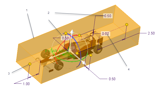3. 单击“偏移”(Offsets)。为除底面外的所有封闭体曲面添加线性偏移。在本示例中,汽车前方曲面的偏移值为 1.0,后方曲面的偏移值为 2.5,顶部及两侧曲面的偏移值为 0.5,底面的偏移值为 0。