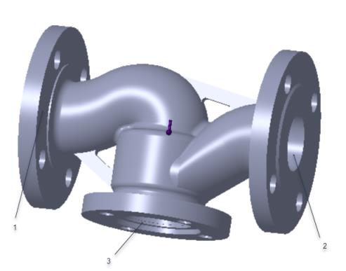 以下示例说明了使用 Creo Simulation Live 设置和运行内部瞬态流动仿真所需的步骤。在本示例中,水以相同的速度从两个入口流入,然后从一个出口流出。