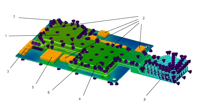 热载荷应用于 PCB 上的不同集成电路组。为隔热屏、PCB 的拐角孔之一和隔热屏的散热片定义边界条件。