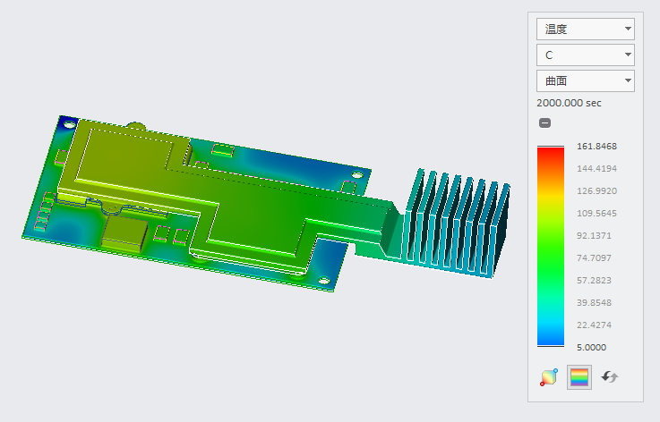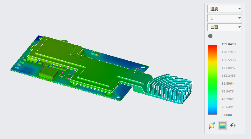 “仿真”(Simulate) 时,PCB 的温度结果在图形窗口中显示为模型上的条纹图。在此示例中,最大温度约为 199 摄氏度。