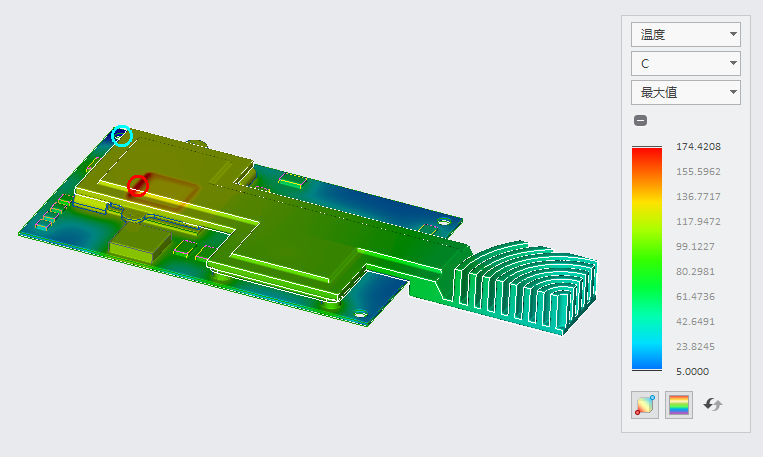 以查看 PCB 上具有最高温度和最低温度的位置。在此示例中,