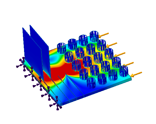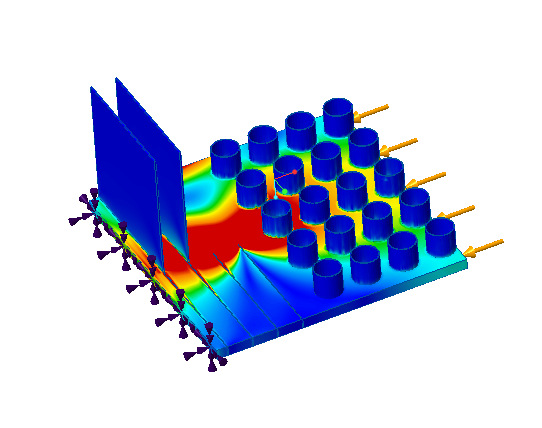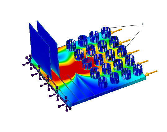 • 所分析的部分相对于模型几何整体尺寸的大小 - 整体几何与特定细薄部分相比越大,则结果的真实度越低。在下面的示例中,载荷施加到具有薄几何的模型,如下所示: