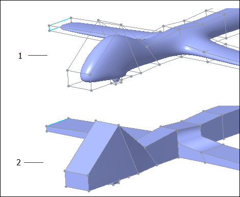 方框模式是自由式中的一种显示模式,在此模式下,会对控制网格而非 B-样条曲面进行着色。它允许您对网格执行快速而复杂的操作,因为在方框模式下不会重新生成曲面。