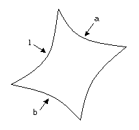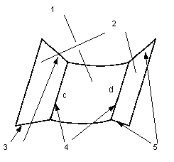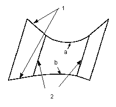 第二个图显示了使用侧曲线影响创建的一个曲面。在本例中,侧曲线用于决定混合曲面侧边界的形状(曲线 a 和 b)。