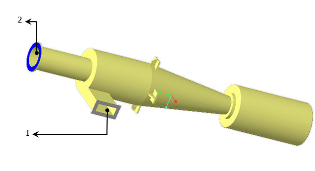旋风分离器用于从气流中移除粒子。空气进入入口端,速度为 2 m/s,包含重粒子和轻粒子。您可以在下图中看到仿真的几何和条件: