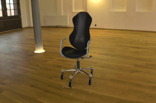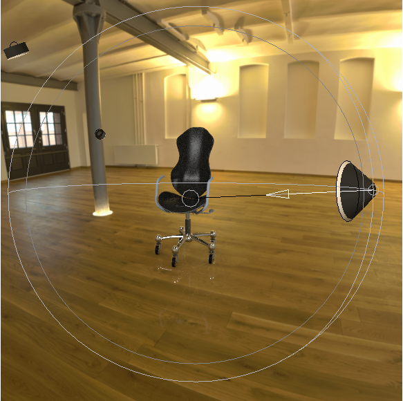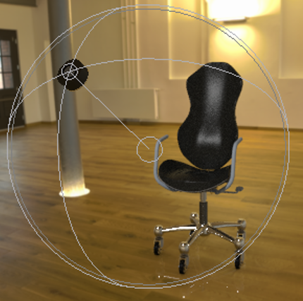 选择“启用阴影”(Enable Shadows) 和“显示光源”(Show Light) 复选框,然后将各个滑块移动至下述所列的值: • “焦点”(Focus) - 100 • “柔和度”(Softness) - 30 • “强度”(Intensity) - 5 椅子的照明区域会发生变化。 | |