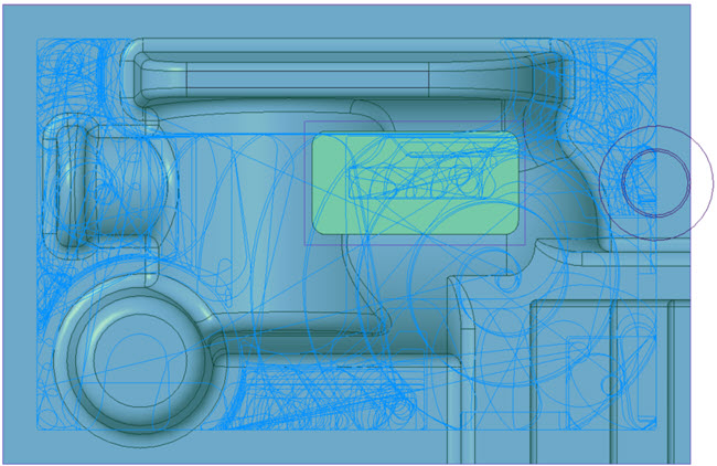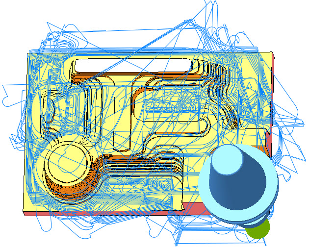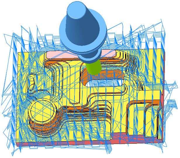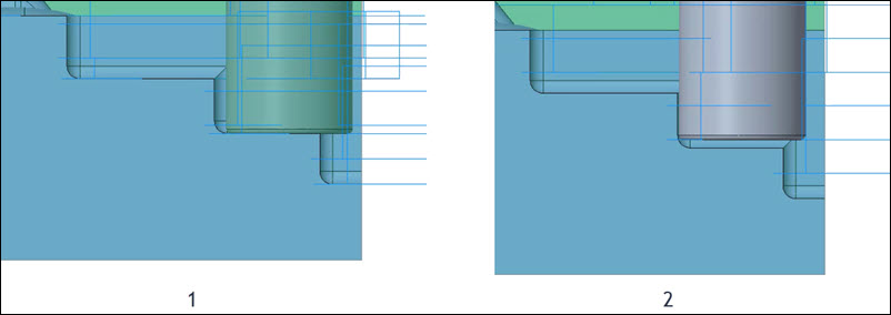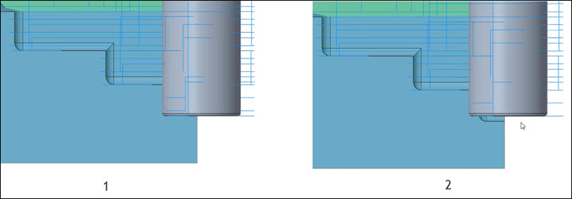 | 使用先前的刀具计算刀具路径时,刀具长度和夹持器几何等限制会影响残料粗加工序列。在这种情况下,您可以通过使用上一坯件生成更精确的刀具路径。 |