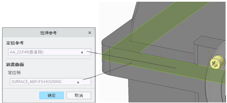 b. 选择盖和外壳的匹配曲面作为“放置曲面”(Placement Surface),然后单击“确定”(OK)。“定义定位销紧固件”(Definition Dowel Pin Fastener) 对话框将会打开。