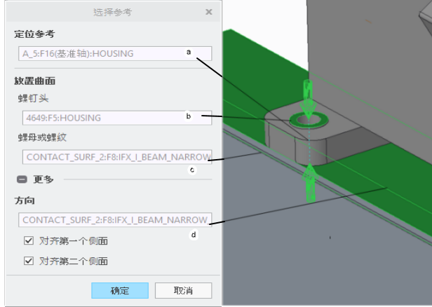 f. 在“选择参考”(Select References) 对话框中,单击“方向”(Orientation) 框以将其激活,然后在工字梁的顶部选择曲面以定义紧固件方向,如图所示。