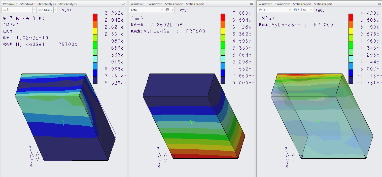 随即打开三个窗口,显示不同的分析结果。可对这些窗口进行调整,以根据需要显示不同结果。您将注意到应力和位移均已降低,其对产品质量造成的影响极小,且最大应力的位置也已移动。