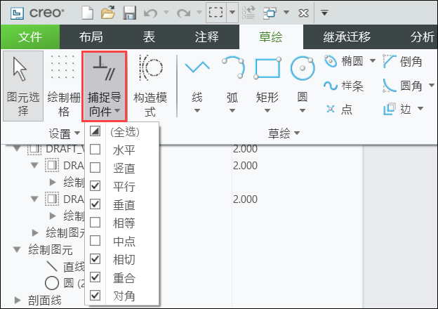与此功能相关的配置选项: | 新配置选项: • dwg_sketch_diagonal_guideyes*/no- 在绘图模式下草绘绘制几何时显示对角导向件。 • dwg_sketch_horizontal_guideyes*/no- 在绘图模式下草绘绘制几何时显示水平对齐导向线。 • dwg_sketch_vertical_guideyes*/no- 在绘图模式下草绘绘制几何时显示竖直对齐导向件。 • dwg_sketch_parallel_guideyes*/no- 在绘图模式下草绘绘制几何时显示平行导向件。 • dwg_sketch_perpendicular_guideyes*/no- 在绘图模式下草绘绘制几何时显示垂直导向件。 • dwg_sketch_tangent_guideyes*/no- 在绘图模式下草绘绘制模几何时显示相切导向件。 • dwg_sketch_equal_guideyes*/no- 在绘图模式下草绘绘制几何时显示等长等径导向件。 • dwg_sketch_coincident_guideyes*/no- 在绘图模式下草绘绘制几何时显示重合导向件。 • dwg_sketch_midpoint_guideyes*/no- 在绘图模式下草绘绘制几何时显示中点导向件。 • dwg_sketch_snap_sensitivityvery_high*/high/medium/low/very_low- 在绘图模式下草绘绘制几何时调整捕捉敏感度。 • dwg_sketch_snap_to_model_geomyes*/no- 允许将草绘图元捕捉到模型几何。 • dwg_sketch_instant_snap_to_geomyes*/no- 当草绘光标放置于几何旁边时,允许瞬时捕捉。 • sketch_ref_list_sensitivityvery_high*/high/medium/low/very_low- 调整将图元添加到“导向件参考”列表所用的时间。 • sketch_max_guide_refs10* (整数 > 0) - 用于指定:可存储用作草绘指引的参考的数目。当用户在草绘器、布局以及绘图内的新型草绘工具中草绘几何时,可使用这些参考。 |