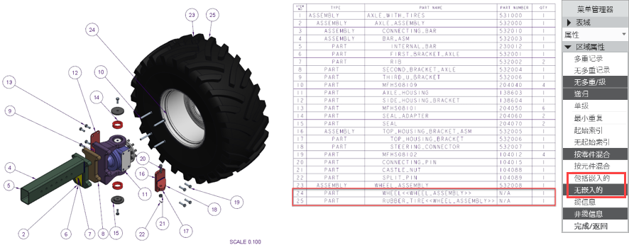 此增强功能可让您控制重复区域 BOM 中嵌入元件的排除。若您已将某些模型转换为不可分离装配或嵌入元件,并希望将它们在 BOM 表中列出 (或排除) 时,此功能非常有用。