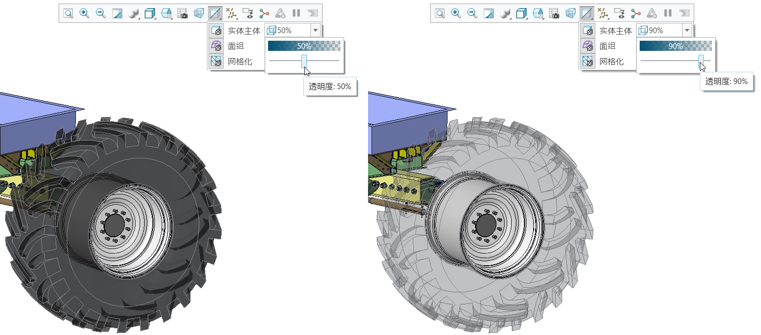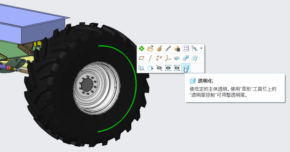 • 在选择元件或主体时,可使用浮动工具栏上的“透明化”图标来选择受影响的实体主体。