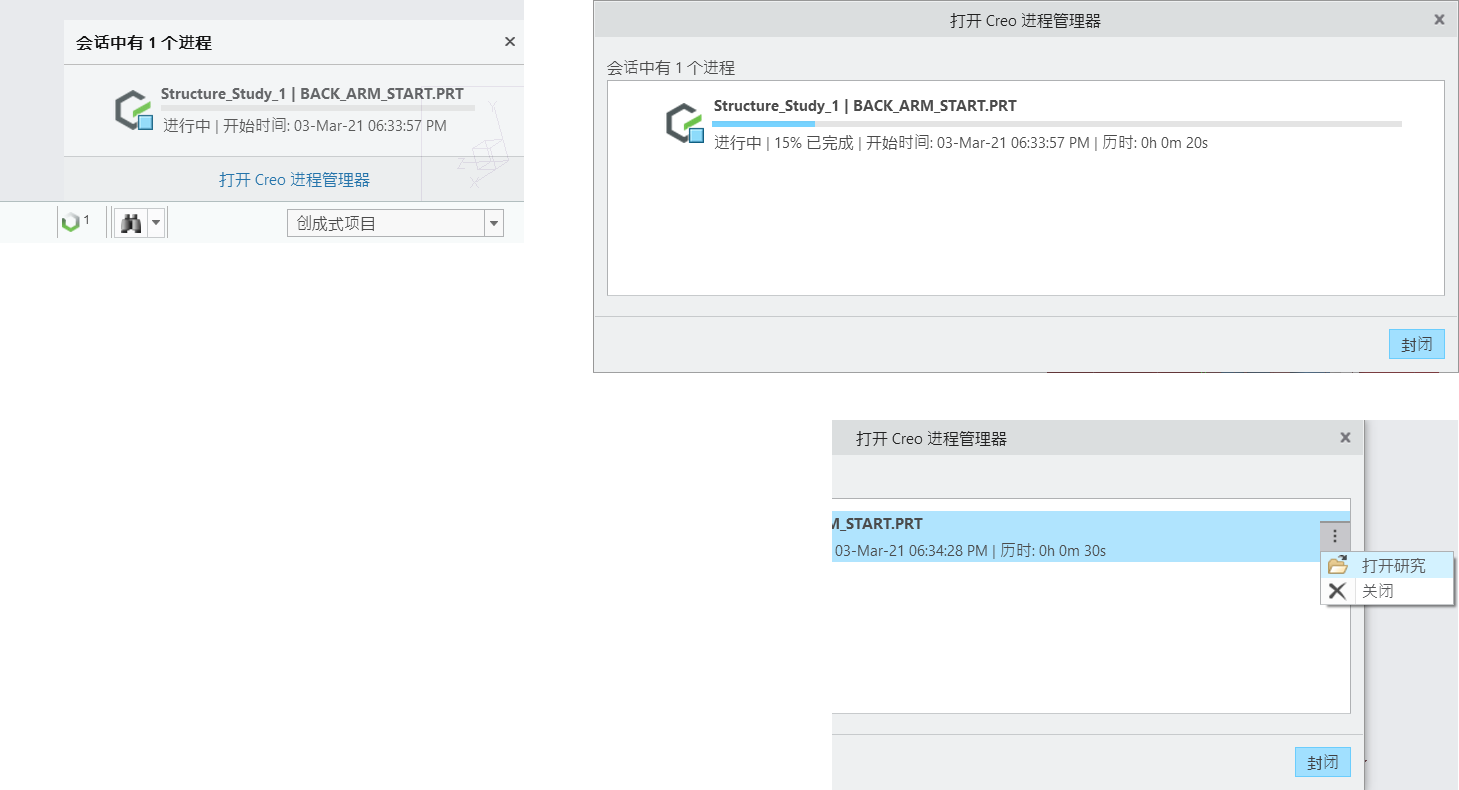 Creo 工艺管理器现列出了在当前 Creo Parametric 会话中执行的所有优化 (单独或多重)。其显示了每个优化的状况,并提供了用于暂停/恢复、停止、打开研究或关闭的其他命令。它还会在优化开始、完成以及发生任何失败时显示通知。