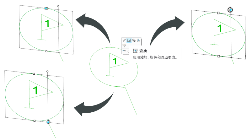 浮动工具栏中新增的上下文“变换”(Transform) 命令可用于快速缩放、旋转和更改其放置符号的符号原点。可使用 SHIFT 键以预定义步长间隔进行快速旋转。
