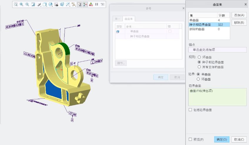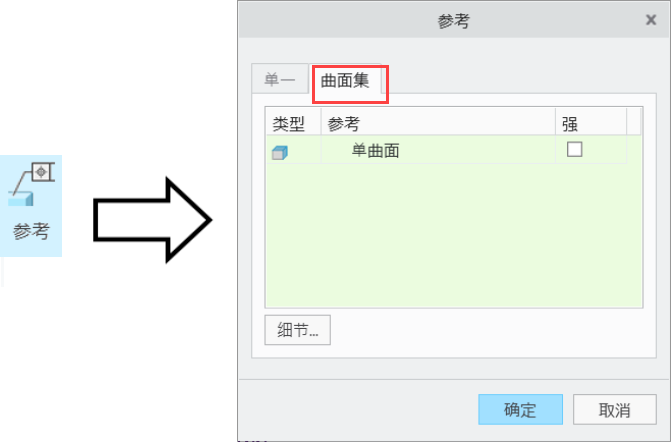 用户界面位置:单击注释语义参考的“参考”(References),然后单击“参考”(References) 对话框中的“曲面集”(Surface Sets)。
