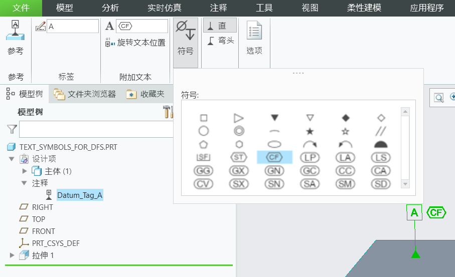 用户界面位置:单击“注释”(Annotate) > “基准特征符号”(Datum Feature Symbol),然后放置 DFS。选择 DFS 以激活文本字段,然后单击“符号”(Symbols)。
