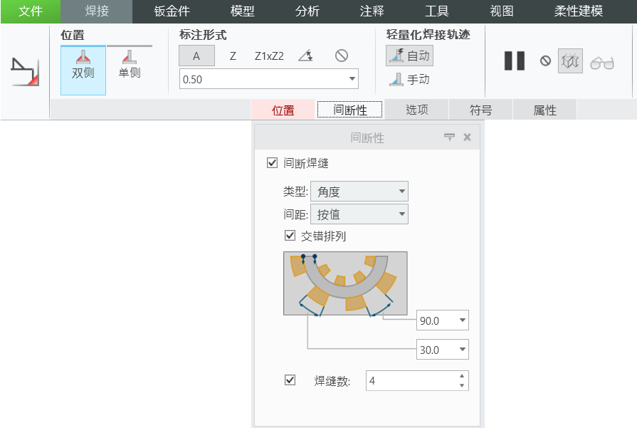 针对间断圆角和坡口/对接焊缝新增了“间断性”(Intermittency) 面板。此面板可定义间距、焊缝数和焊缝间距。
